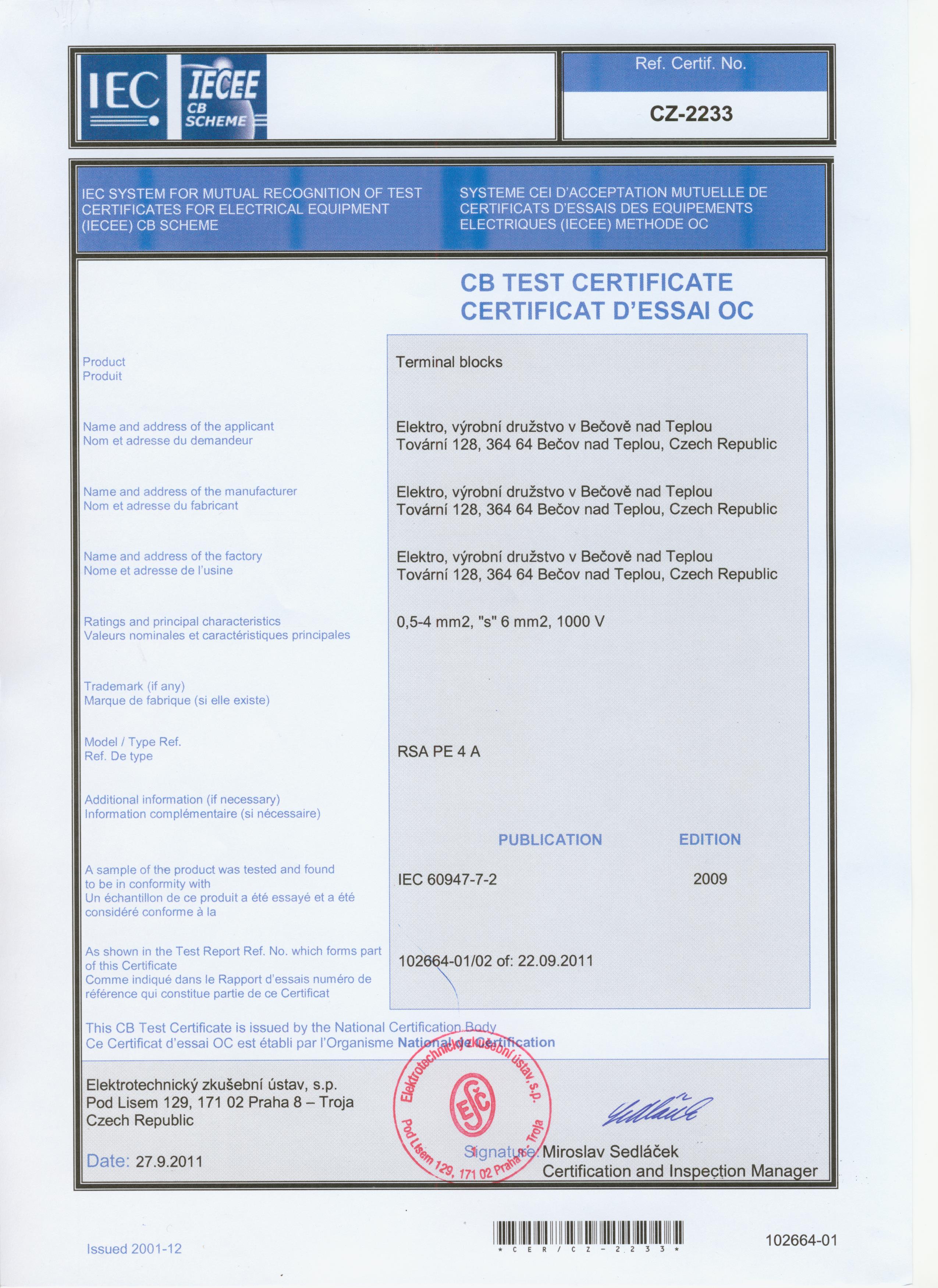 | Испытания | ČSN EN 60947-7-2 |